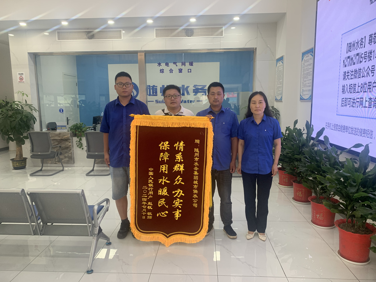 近日,中國人民銀行用戶將一面繡有“情系群眾辦實(shí)事 保障用水暖民心”的錦旗送到隨州市水務(wù)集團(tuán)城市供水公司共享營業(yè)廳。感謝運(yùn)維中心維修人員急用戶之所急、憂用戶之所憂、真心為用戶考慮,解決其用水問題。