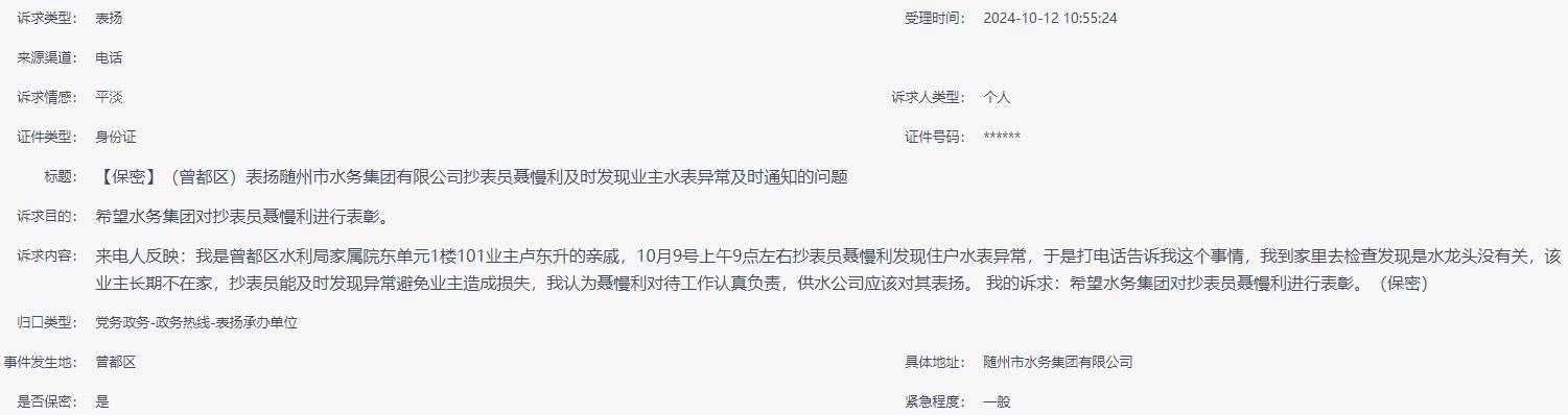 【保密】(曾都區(qū))表?yè)P(yáng)隨州市水務(wù)集團(tuán)有限公司抄表員聶慢利及時(shí)發(fā)現(xiàn)業(yè)主水表異常及時(shí)通知的問(wèn)題 |