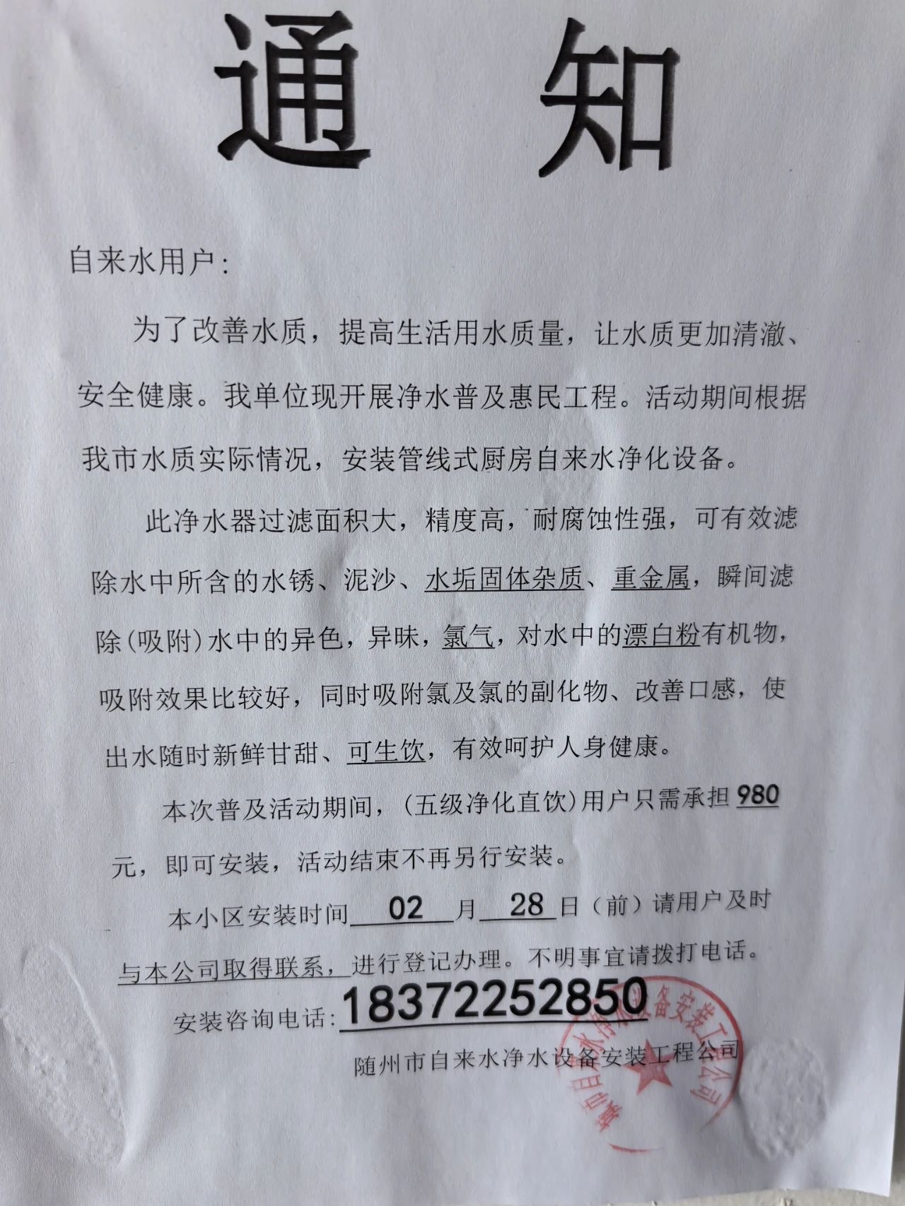 近期,我公司在隨州城區(qū)多個(gè)小區(qū)發(fā)現(xiàn)以“隨州市自來(lái)水凈水設(shè)備安裝工程公司”“隨州市二水自來(lái)水安裝工程有限公司”等公司名義張貼的《通知》。該行為打著改善自來(lái)水水質(zhì)的幌子,誤導(dǎo)自來(lái)水用戶,推銷凈水設(shè)備,已造成惡劣影響?,F(xiàn)為維護(hù)我公司和廣大市民的合法權(quán)益,特鄭重聲明如下: