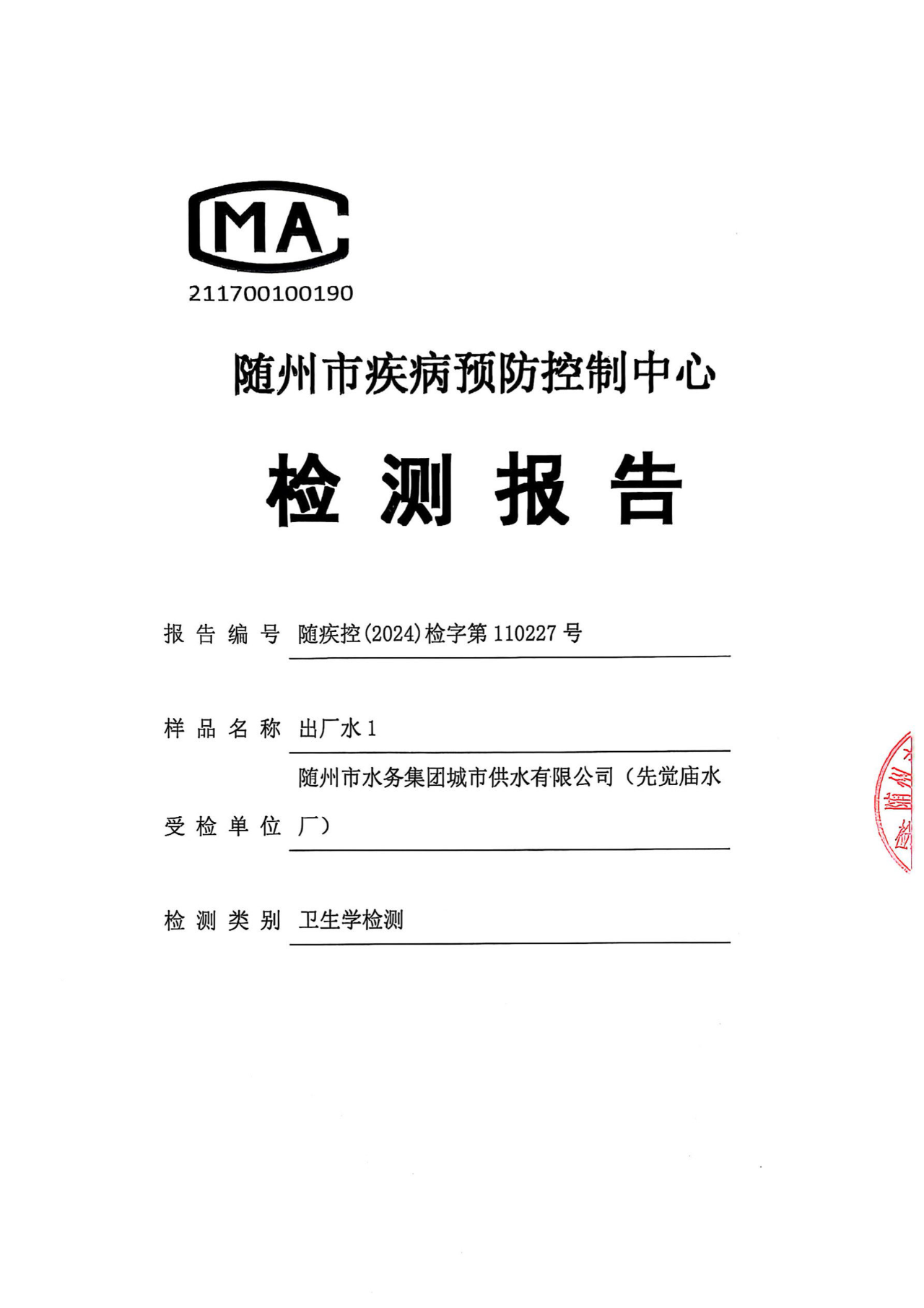 城市供水出廠水水質(zhì)檢測(cè)報(bào)告